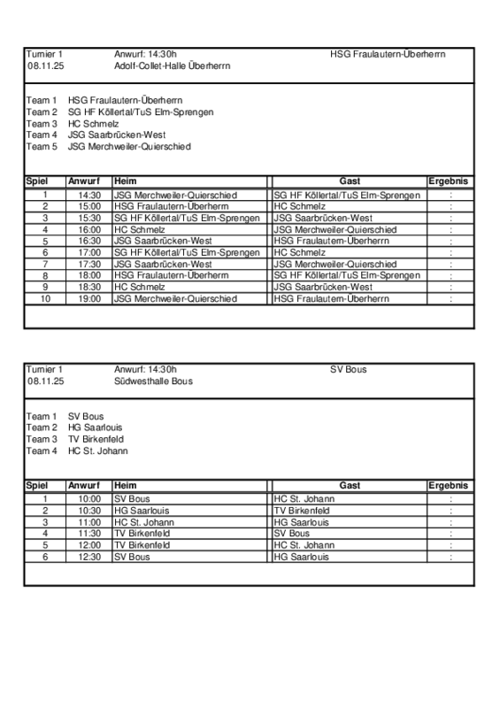 Spielplan der Gruppe 1 des Topolino-Cups 2025 für die männliche C-Jugend. Ausrichter in diesem Jahre ist die HSG Fraulautern-Überherrn.