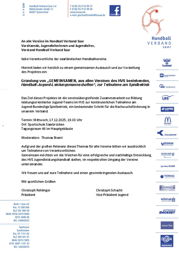 Gründung von „GEMEINSAMEN, aus allen Vereinen des HVS bestehenden Handball-Jugend-Leistungsmannschaften“